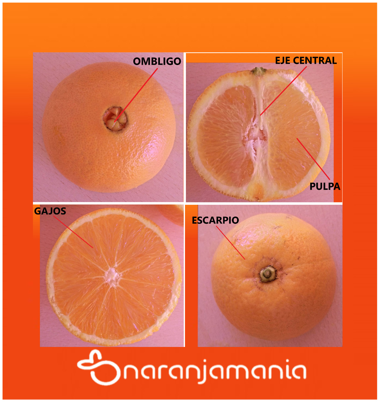 - Eje central: es la parte central de la naranja, el «cordón» blanco en el centro de la fruta.
